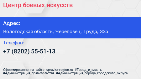 Центр боевых искусств по адресу Вологодская область, Череповец, Труда, 33а в дальнейшем Организация, размещена в следующих категориях: