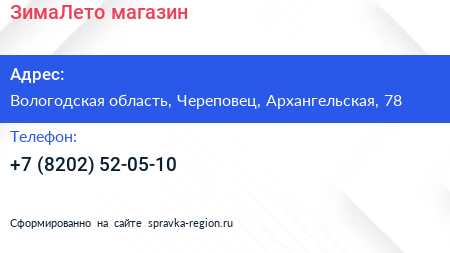 ЗимаЛето, магазин по адресу Вологодская область, Череповец, Архангельская, 78 в дальнейшем Организация, размещена в следующих категориях: