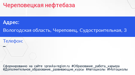 Череповецкая нефтебаза по адресу Вологодская область, Череповец, Судостроительная, 3 в дальнейшем Организация, размещена в следующих категориях: