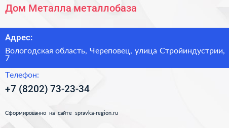Дом Металла, металлобаза по адресу Вологодская область, Череповец, улица Стройиндустрии, 7 в дальнейшем Организация, размещена в следующих категориях: