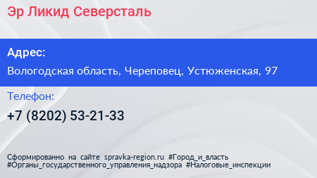 Эр Ликид Северсталь по адресу Вологодская область, Череповец, Устюженская, 97 в дальнейшем Организация, размещена в следующих категориях:
