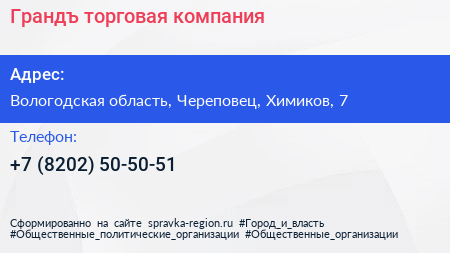 Грандъ, торговая компания по адресу Вологодская область, Череповец, Химиков, 7 в дальнейшем Организация, размещена в следующих категориях:
