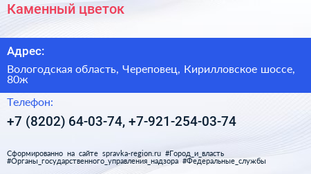 Каменный цветок по адресу Вологодская область, Череповец, Кирилловское шоссе, 80ж в дальнейшем Организация, размещена в следующих категориях: