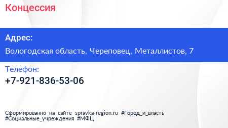 Концессия по адресу Вологодская область, Череповец, Металлистов, 7 в дальнейшем Организация, размещена в следующих категориях: