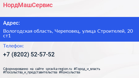 НордМашСервис по адресу Вологодская область, Череповец, улица Строителей, 20 ст1 в дальнейшем Организация, размещена в следующих категориях: