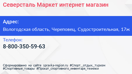 Северсталь Маркет, интернет-магазин по адресу Вологодская область, Череповец, Судостроительная, 17ж в дальнейшем Организация, размещена в следующих категориях: