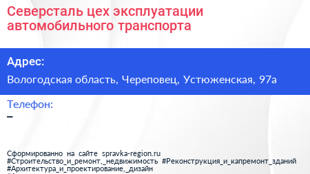 Северсталь, цех эксплуатации автомобильного транспорта по адресу Вологодская область, Череповец, Устюженская, 97а в дальнейшем Организация, размещена в следующих категориях: