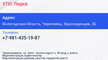 УПО Лидер по адресу Вологодская область, Череповец, Краснодонцев, 3Б в дальнейшем Организация, размещена в следующих категориях: