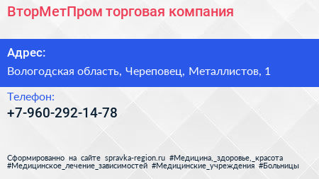 ВторМетПром, торговая компания по адресу Вологодская область, Череповец, Металлистов, 1 в дальнейшем Организация, размещена в следующих категориях: