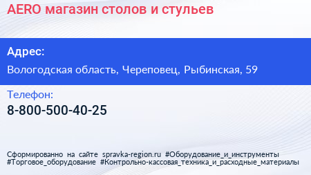 AERO, магазин столов и стульев по адресу Вологодская область, Череповец, Рыбинская, 59 в дальнейшем Организация, размещена в следующих категориях: