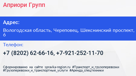 Априори Групп по адресу Вологодская область, Череповец, Шекснинский проспект, 6 в дальнейшем Организация, размещена в следующих категориях: