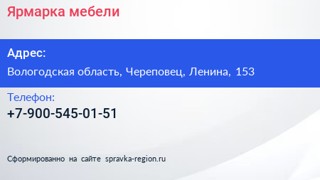 Ярмарка мебели по адресу Вологодская область, Череповец, Ленина, 153 в дальнейшем Организация, размещена в следующих категориях: