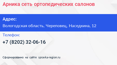 Арника, сеть ортопедических салонов по адресу Вологодская область, Череповец, Наседкина, 12 в дальнейшем Организация, размещена в следующих категориях:
