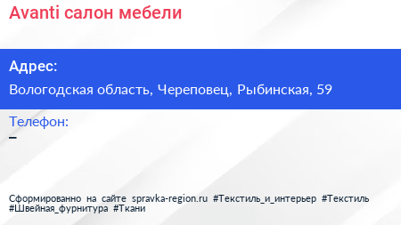 Avanti, салон мебели по адресу Вологодская область, Череповец, Рыбинская, 59 в дальнейшем Организация, размещена в следующих категориях: