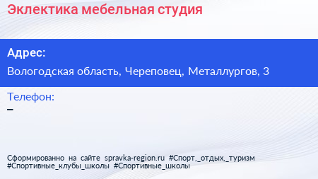 Эклектика, мебельная студия по адресу Вологодская область, Череповец, Металлургов, 3 в дальнейшем Организация, размещена в следующих категориях: