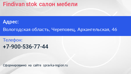 Findivan-stok, салон мебели по адресу Вологодская область, Череповец, Архангельская, 46 в дальнейшем Организация, размещена в следующих категориях: