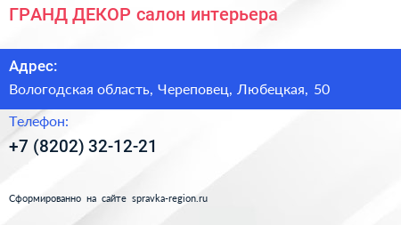 ГРАНД ДЕКОР, салон интерьера по адресу Вологодская область, Череповец, Любецкая, 50 в дальнейшем Организация, размещена в следующих категориях: