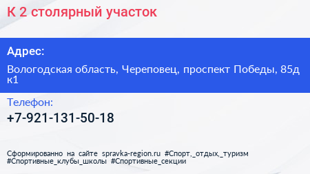 К-2, столярный участок по адресу Вологодская область, Череповец, проспект Победы, 85д к1 в дальнейшем Организация, размещена в следующих категориях: