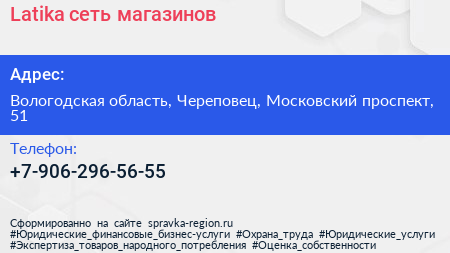 Latika, сеть магазинов по адресу Вологодская область, Череповец, Московский проспект, 51 в дальнейшем Организация, размещена в следующих категориях: