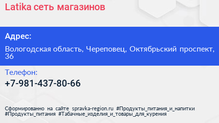 Latika, сеть магазинов по адресу Вологодская область, Череповец, Октябрьский проспект, 36 в дальнейшем Организация, размещена в следующих категориях: