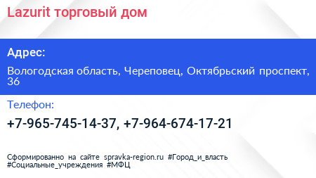 Lazurit, торговый дом по адресу Вологодская область, Череповец, Октябрьский проспект, 36 в дальнейшем Организация, размещена в следующих категориях: