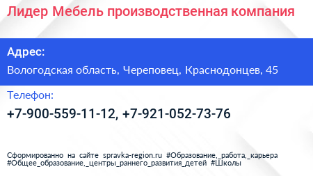 Лидер Мебель, производственная компания по адресу Вологодская область, Череповец, Краснодонцев, 45 в дальнейшем Организация, размещена в следующих категориях: