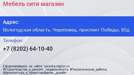 Мебель сити, магазин по адресу Вологодская область, Череповец, проспект Победы, 85д в дальнейшем Организация, размещена в следующих категориях:
