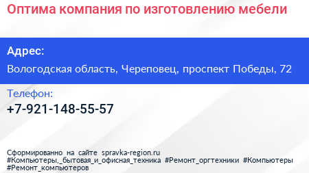 Оптима, компания по изготовлению мебели по адресу Вологодская область, Череповец, проспект Победы, 72 в дальнейшем Организация, размещена в следующих категориях: