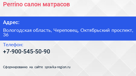 Perrino, салон матрасов по адресу Вологодская область, Череповец, Октябрьский проспект, 36 в дальнейшем Организация, размещена в следующих категориях: