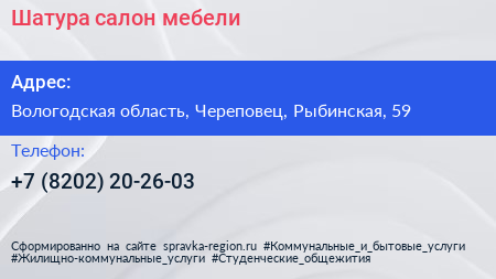 Шатура, салон мебели по адресу Вологодская область, Череповец, Рыбинская, 59 в дальнейшем Организация, размещена в следующих категориях:
