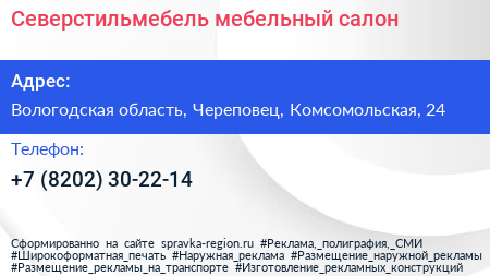 Северстильмебель, мебельный салон по адресу Вологодская область, Череповец, Комсомольская, 24 в дальнейшем Организация, размещена в следующих категориях: