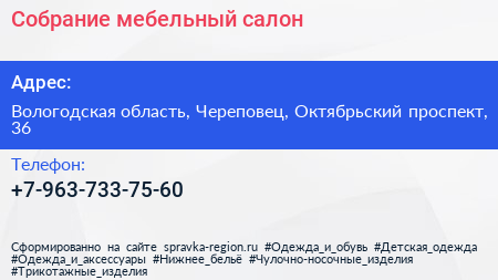 Собрание, мебельный салон по адресу Вологодская область, Череповец, Октябрьский проспект, 36 в дальнейшем Организация, размещена в следующих категориях: