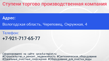 Ступени, торгово-производственная компания по адресу Вологодская область, Череповец, Окружная, 4 в дальнейшем Организация, размещена в следующих категориях: