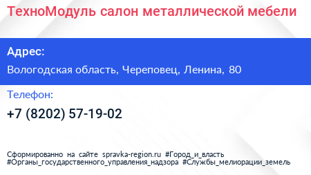 ТехноМодуль, салон металлической мебели по адресу Вологодская область, Череповец, Ленина, 80 в дальнейшем Организация, размещена в следующих категориях:
