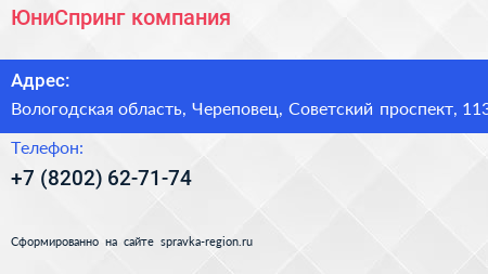 ЮниСпринг, компания по адресу Вологодская область, Череповец, Советский проспект, 113 в дальнейшем Организация, размещена в следующих категориях: