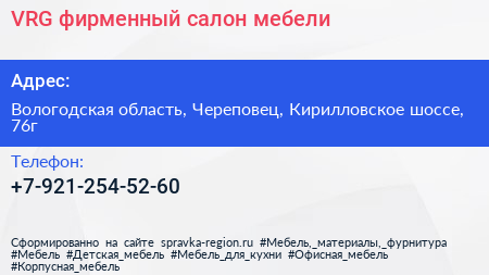 VRG, фирменный салон мебели по адресу Вологодская область, Череповец, Кирилловское шоссе, 76г в дальнейшем Организация, размещена в следующих категориях: