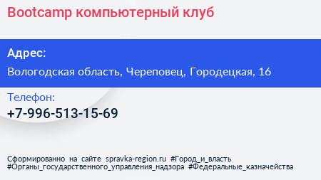 Bootcamp, компьютерный клуб по адресу Вологодская область, Череповец, Городецкая, 16 в дальнейшем Организация, размещена в следующих категориях: