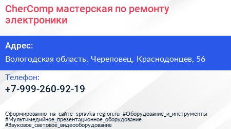 CherComp, мастерская по ремонту электроники по адресу Вологодская область, Череповец, Краснодонцев, 56 в дальнейшем Организация, размещена в следующих категориях: