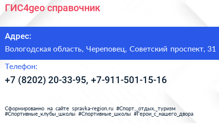 ГИС4geo, справочник по адресу Вологодская область, Череповец, Советский проспект, 31 в дальнейшем Организация, размещена в следующих категориях: