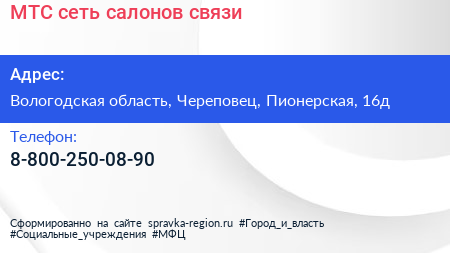 МТС, сеть салонов связи по адресу Вологодская область, Череповец, Пионерская, 16д в дальнейшем Организация, размещена в следующих категориях: