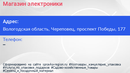 Магазин электроники по адресу Вологодская область, Череповец, проспект Победы, 177 в дальнейшем Организация, размещена в следующих категориях: