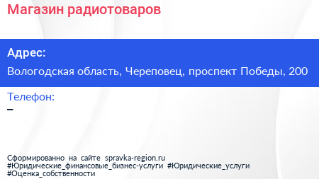 Магазин радиотоваров по адресу Вологодская область, Череповец, проспект Победы, 200 в дальнейшем Организация, размещена в следующих категориях: