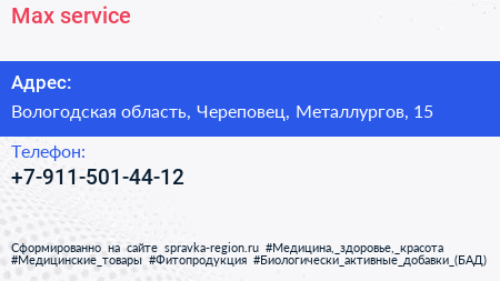 Max service по адресу Вологодская область, Череповец, Металлургов, 15 в дальнейшем Организация, размещена в следующих категориях: