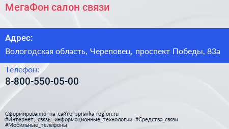 МегаФон, салон связи по адресу Вологодская область, Череповец, проспект Победы, 83а в дальнейшем Организация, размещена в следующих категориях: