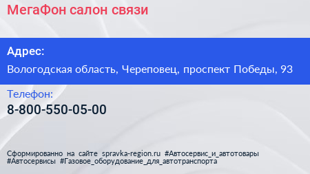 МегаФон, салон связи по адресу Вологодская область, Череповец, проспект Победы, 93 в дальнейшем Организация, размещена в следующих категориях: