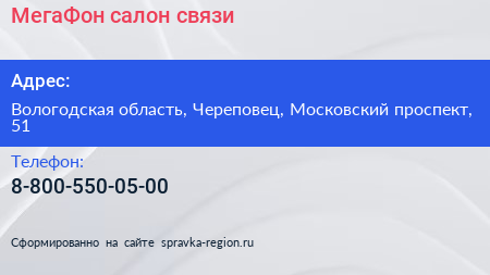 МегаФон, салон связи по адресу Вологодская область, Череповец, Московский проспект, 51 в дальнейшем Организация, размещена в следующих категориях: