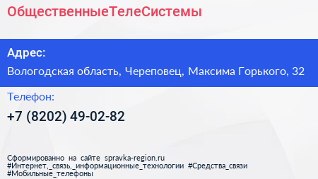 ОбщественныеТелеСистемы по адресу Вологодская область, Череповец, Максима Горького, 32 в дальнейшем Организация, размещена в следующих категориях: