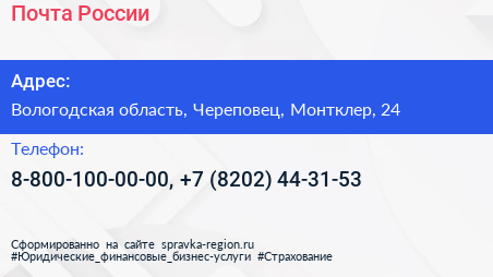 Почта России по адресу Вологодская область, Череповец, Монтклер, 24 в дальнейшем Организация, размещена в следующих категориях: