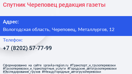 Спутник Череповец, редакция газеты по адресу Вологодская область, Череповец, Металлургов, 12 в дальнейшем Организация, размещена в следующих категориях: