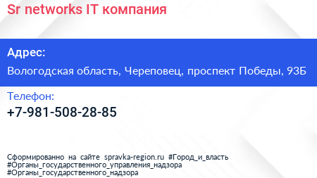 Sr-networks, IT-компания по адресу Вологодская область, Череповец, проспект Победы, 93Б в дальнейшем Организация, размещена в следующих категориях: